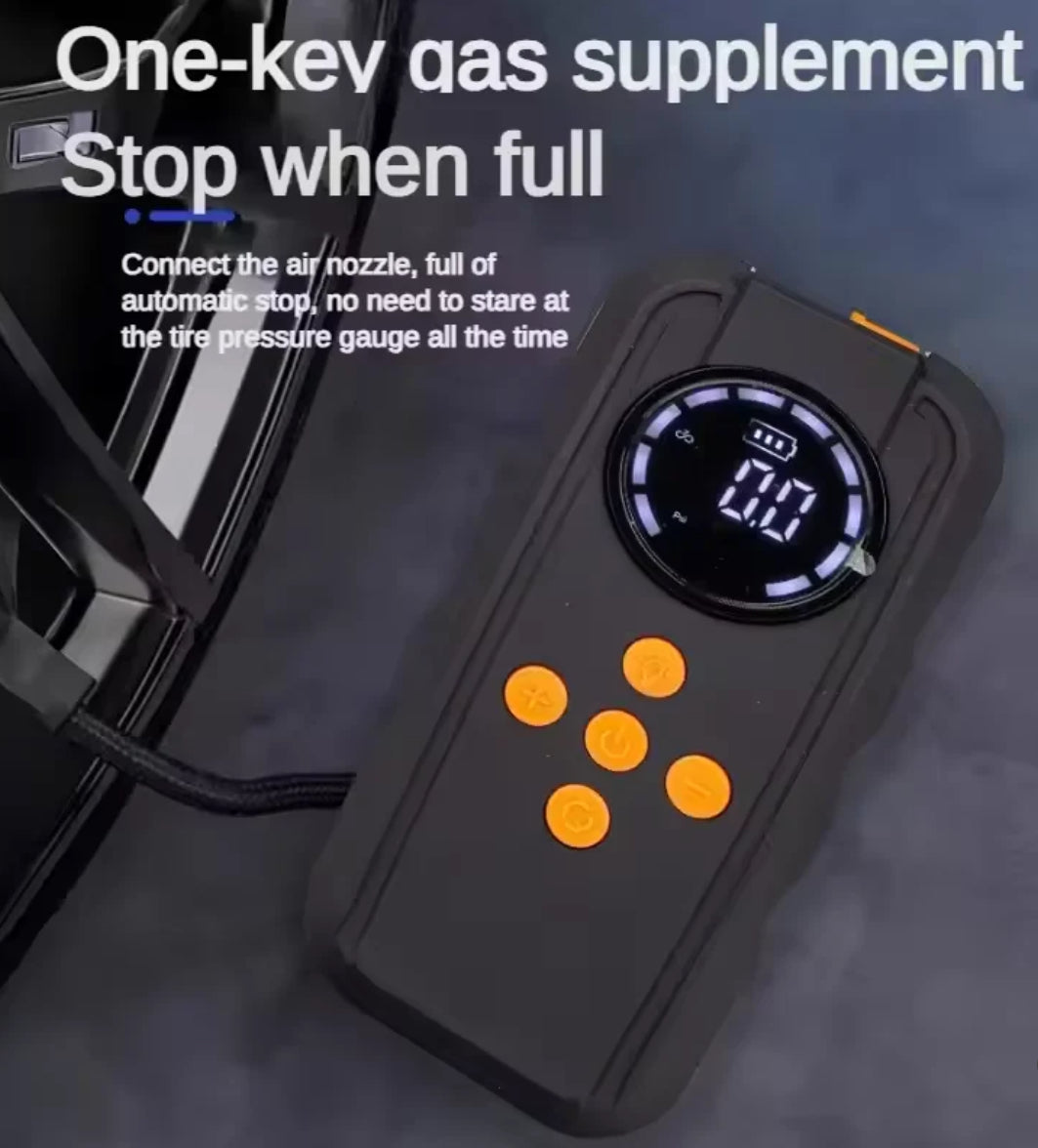 جهاز ذكي 4 في 1 يجمع بين منفاخ إطارات ، وباور بنك للطوارئ، وشاحن بطارية للسيارة بتيار يصل إلى ، بالإضافة إلى مصباح LED قوي للإضاءة الليلية. مزود بقدرة عالية ، شاشة رقمية لقياس ضغط الإطارات، ووظائف أمان متعددة تجعله الحل المثالي لحالات الطوارئ على الطريق.